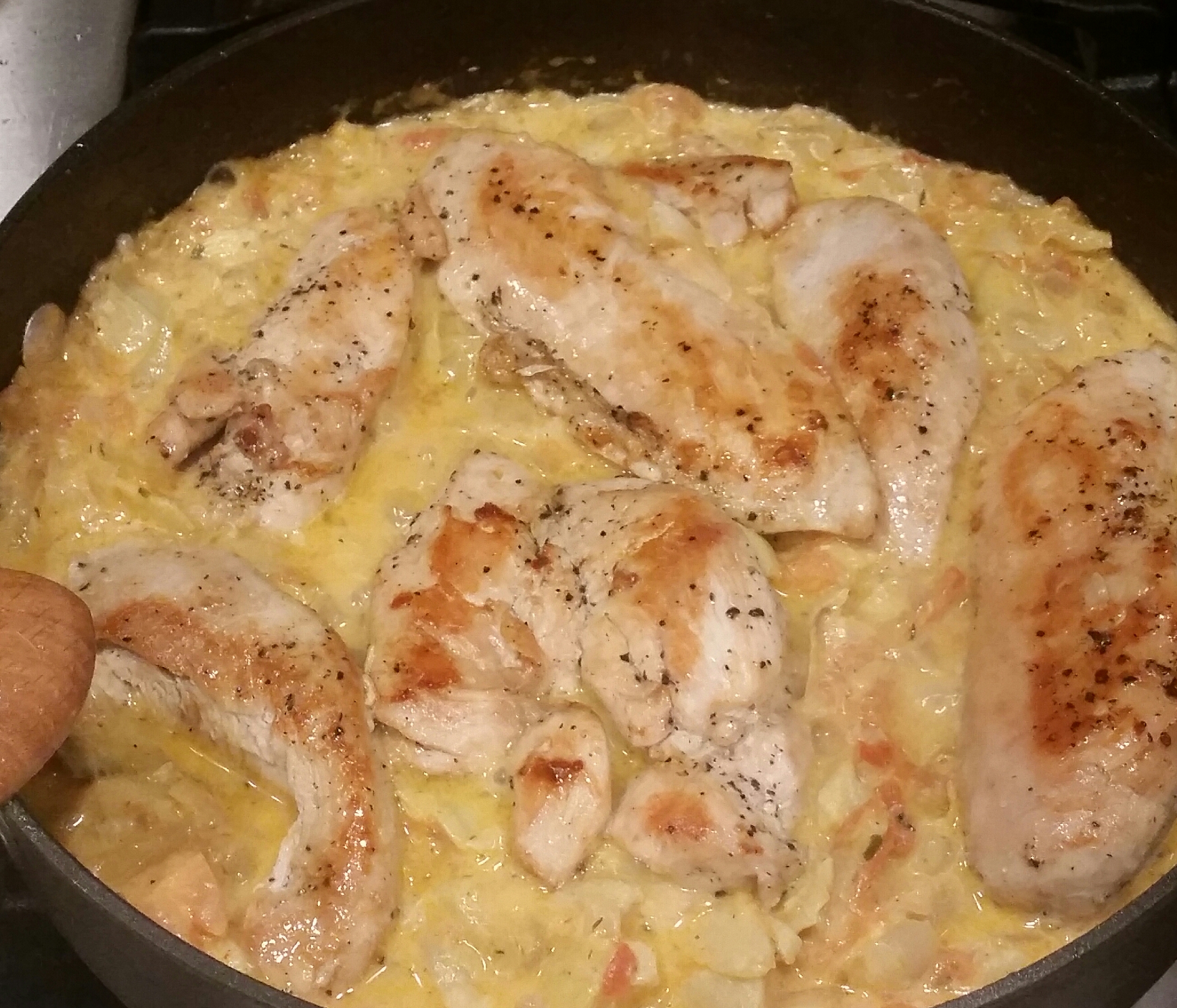 Add the chicken back in and cook on med heat for another 10 minutes until the chicken is cooked through and no longer pink on the inside. I can always usually tell when chicken is done by pushing down on it with my cooking spoon. It will have a hard feeling to it. Also if I am really unsure I will cut into them but I normally don’t like to do that because then you release all the juices and the chicken could then dry out.