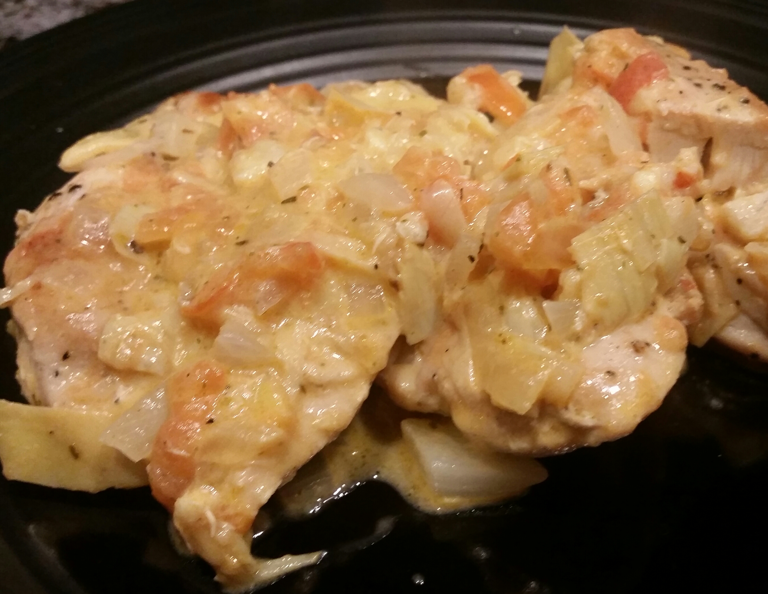 In the same pan add the onion and cook for about a minute or two then add the white wine, tomato, artichokes, thyme, salt, and pepper. Also pour in about a Tbsp of the artichoke oil from the jar they came in. You can discard the rest now 🙂 Cook down for about 15 minutes on med heat. Then add in the heavy cream and lower to a simmer for about 5 minutes.