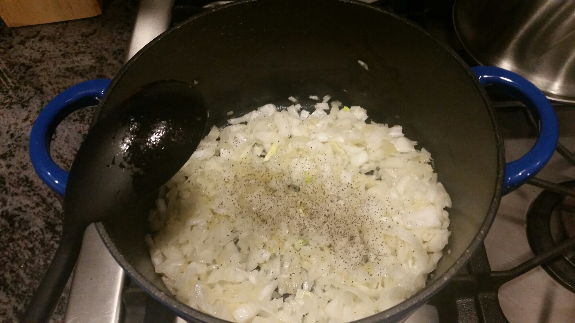 First heat the oil in a dutch oven or large pot and then add your onion, garlic, salt, and pepper-cook until fragrant, about 5 or 6 minutes.