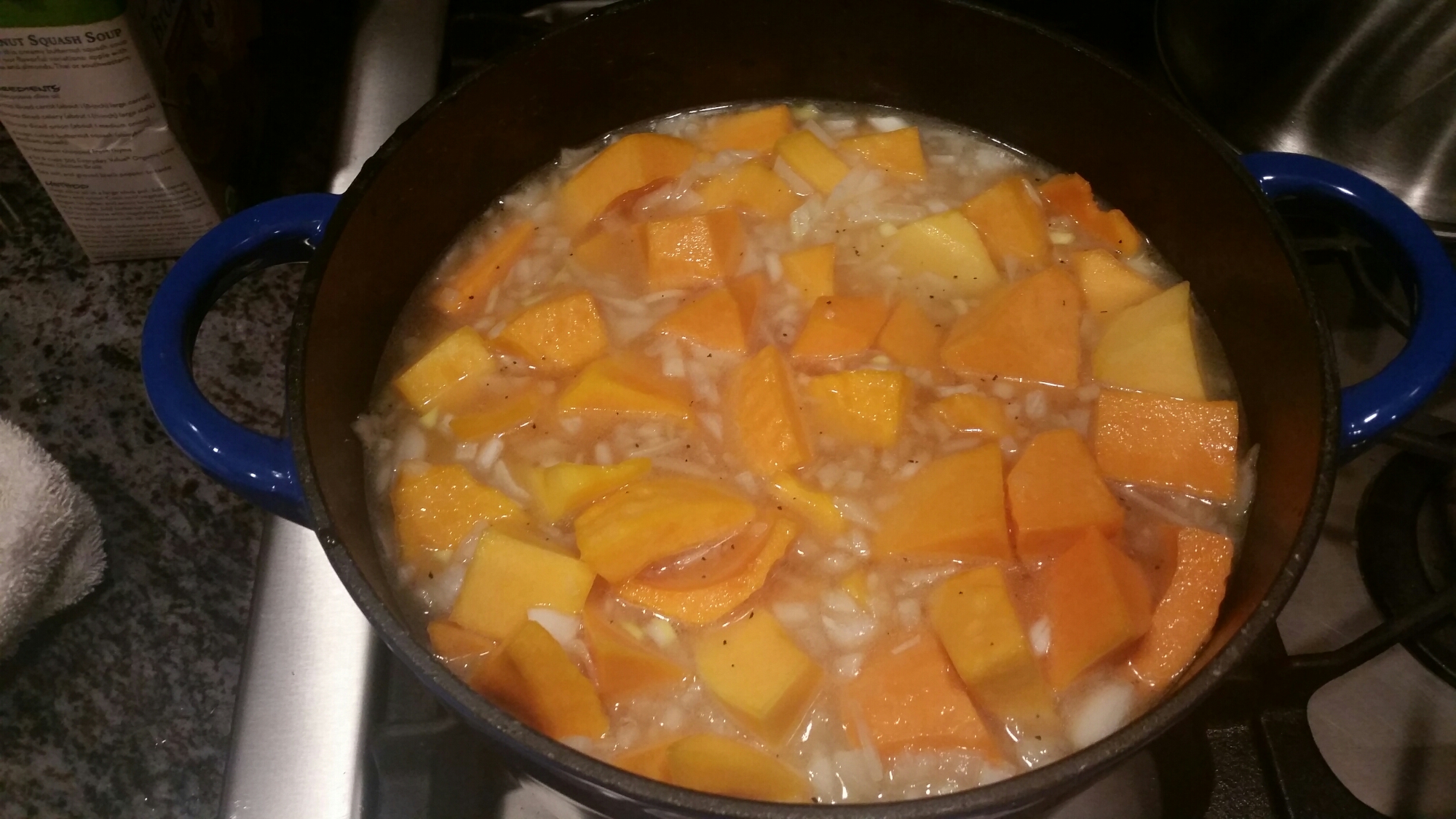 Add in in the chicken broth and butternut squash and add the lid and cook for 45 mins or until squash is cooked and fork tender-remove from heat.