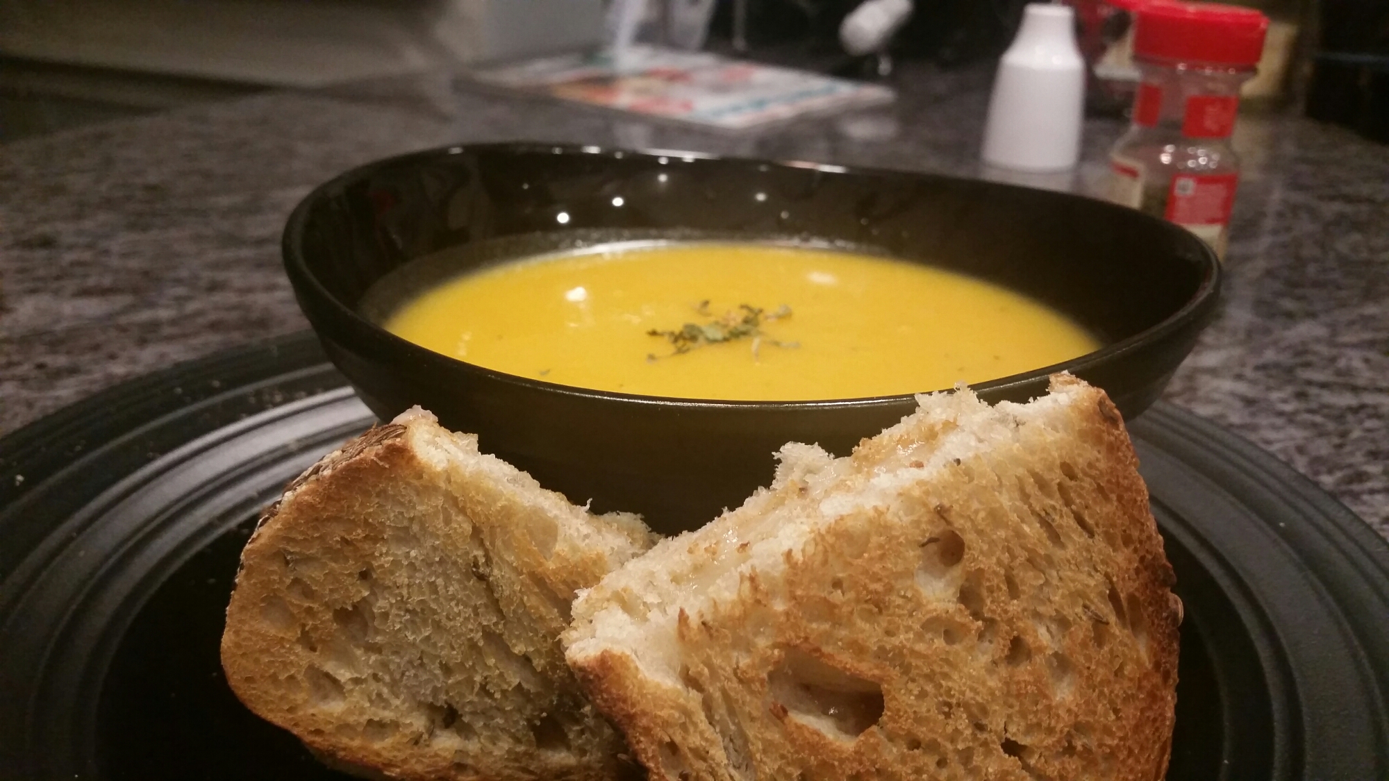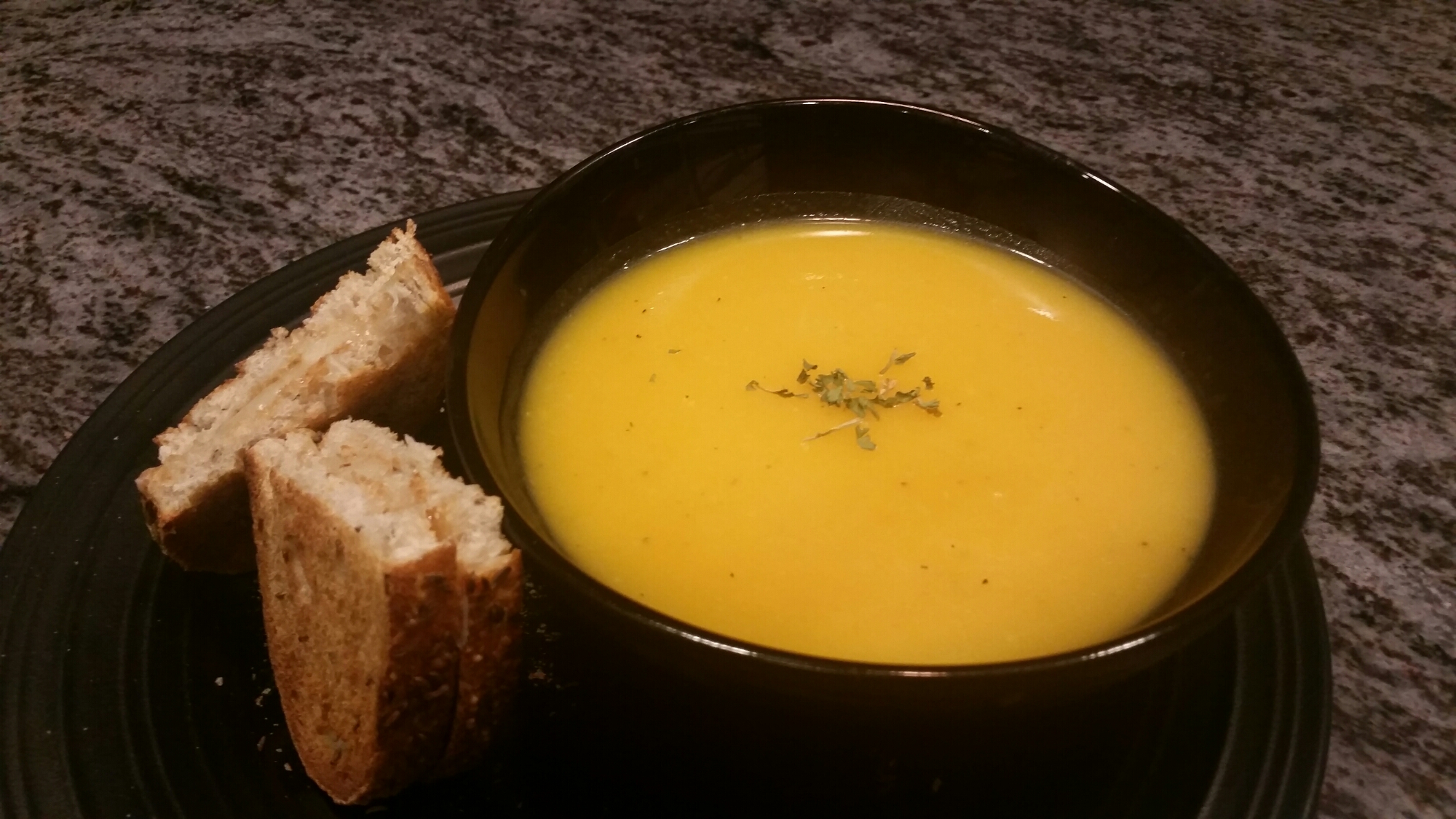 If you have an immersion blender then blend until you reach a thick bisque consistency. If you do not have an immersion blender then you can use a regular blender. Side Bar-BE VERY CAREFUL when dealing with transferring to and from a blender-definitely NOT something you want to rush through and you should wait until the soup has cooled a bit. Add some more salt and pepper and stir-set aside