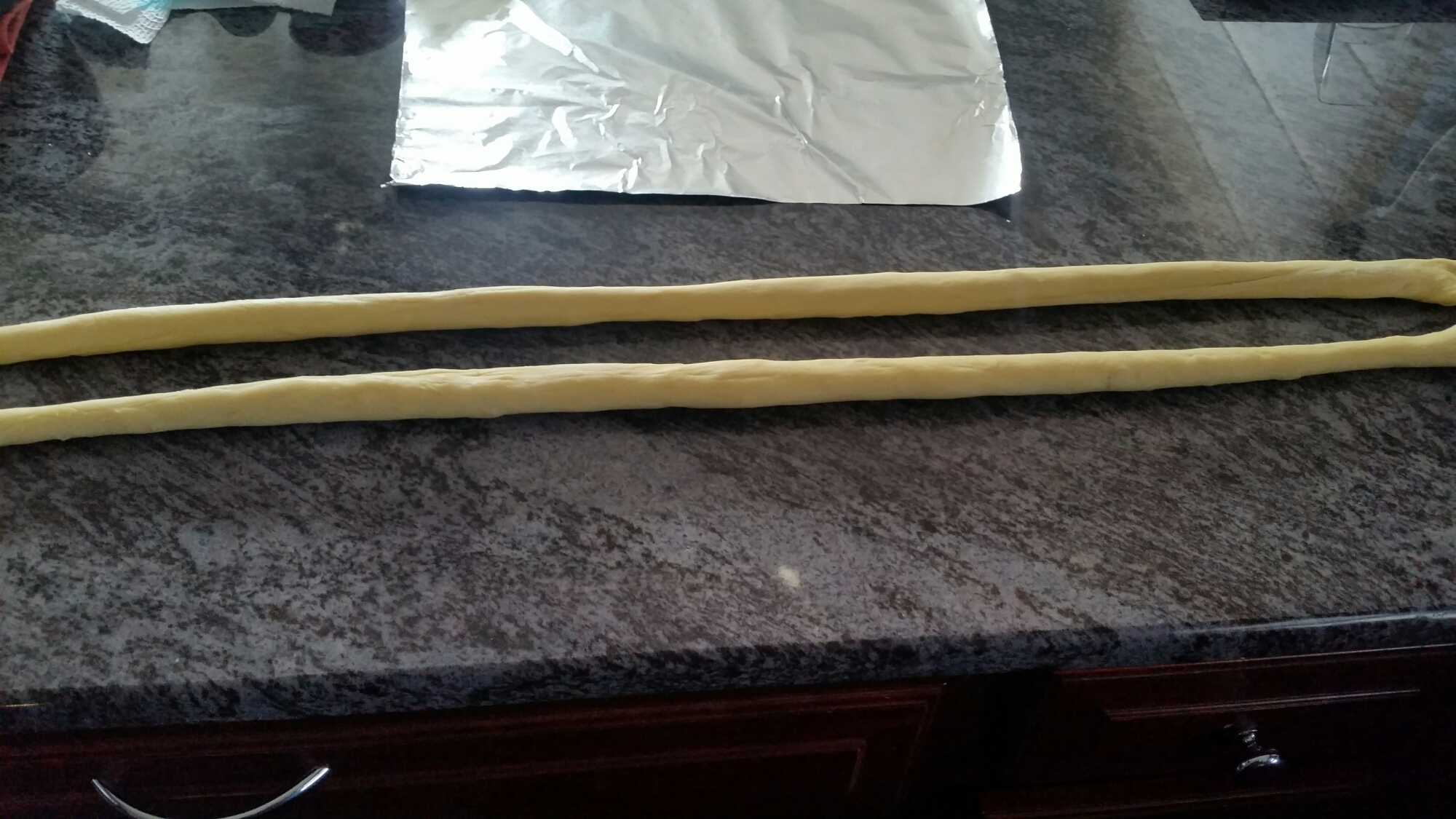 After an hour remove the dough and press it down in the middle and slice it in 2 equal halves. Roll each half into a 2 foot piece.