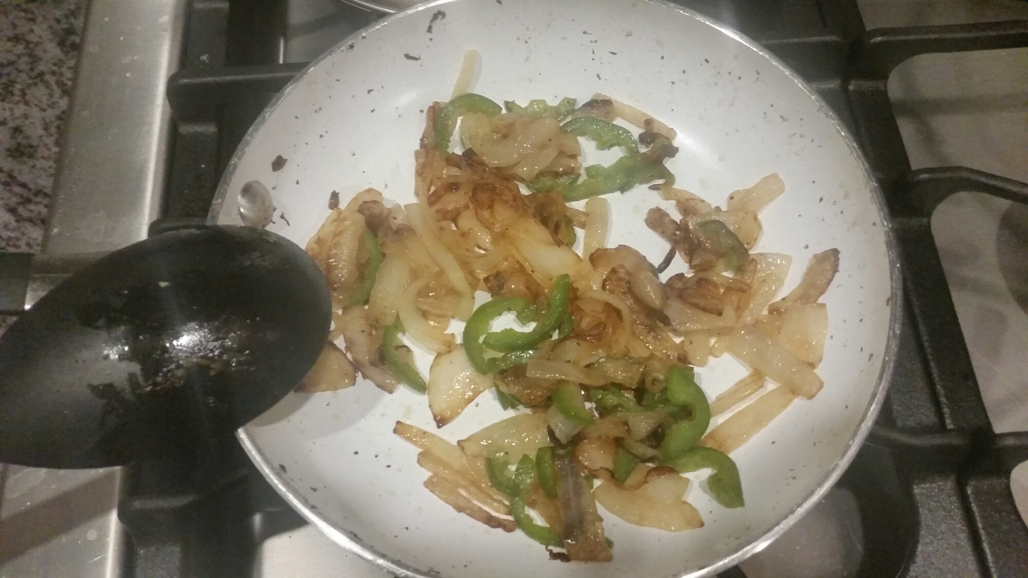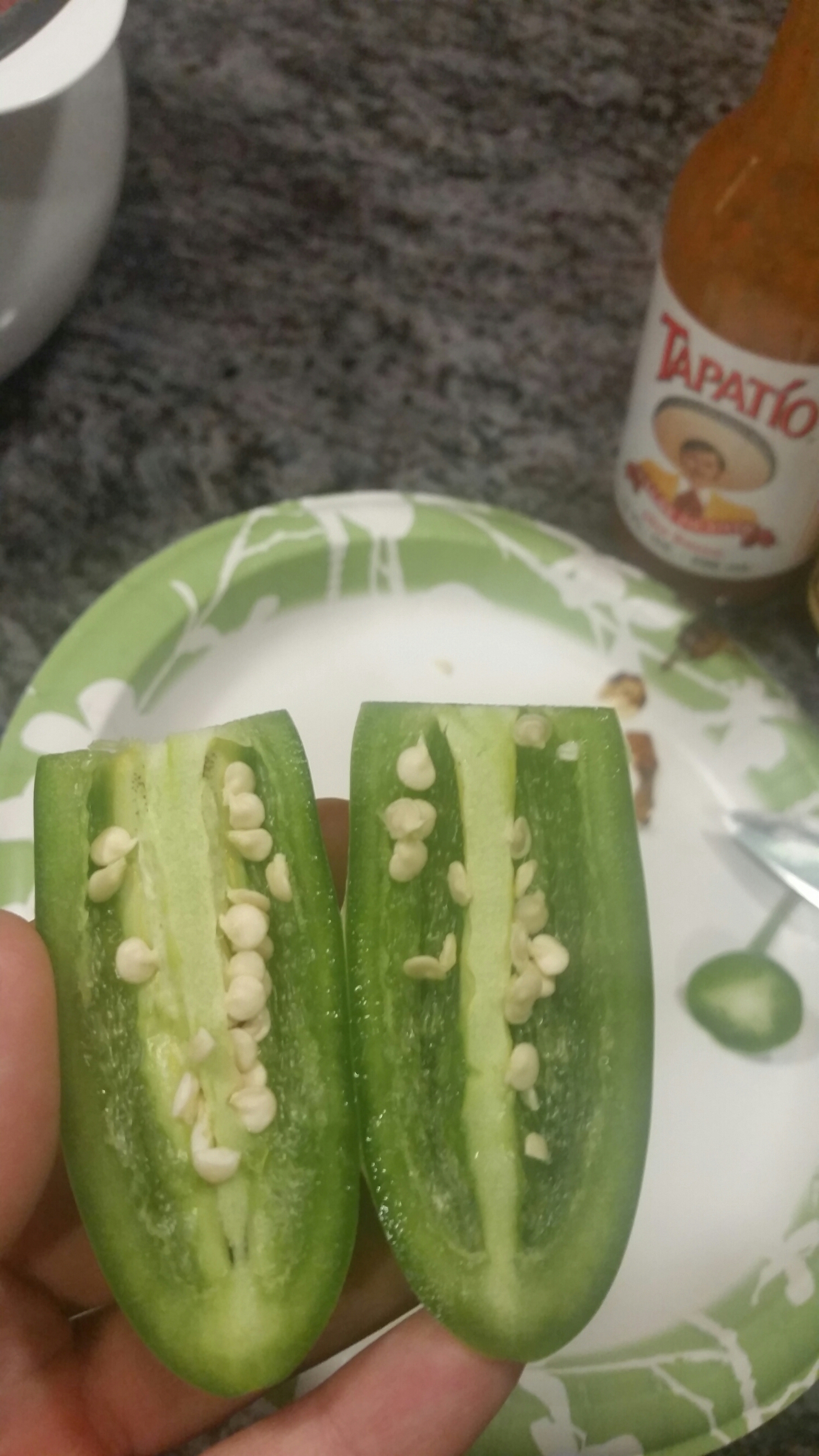 When they look golden brown get a Jalepeno. I had a small one. I recommend a small one as they are pretty spicy!! Your gonna wanna take out all those little seeds as that is where the spice lives. Unless you want atomic onions!! Slice them thin then toss them in with the onions.