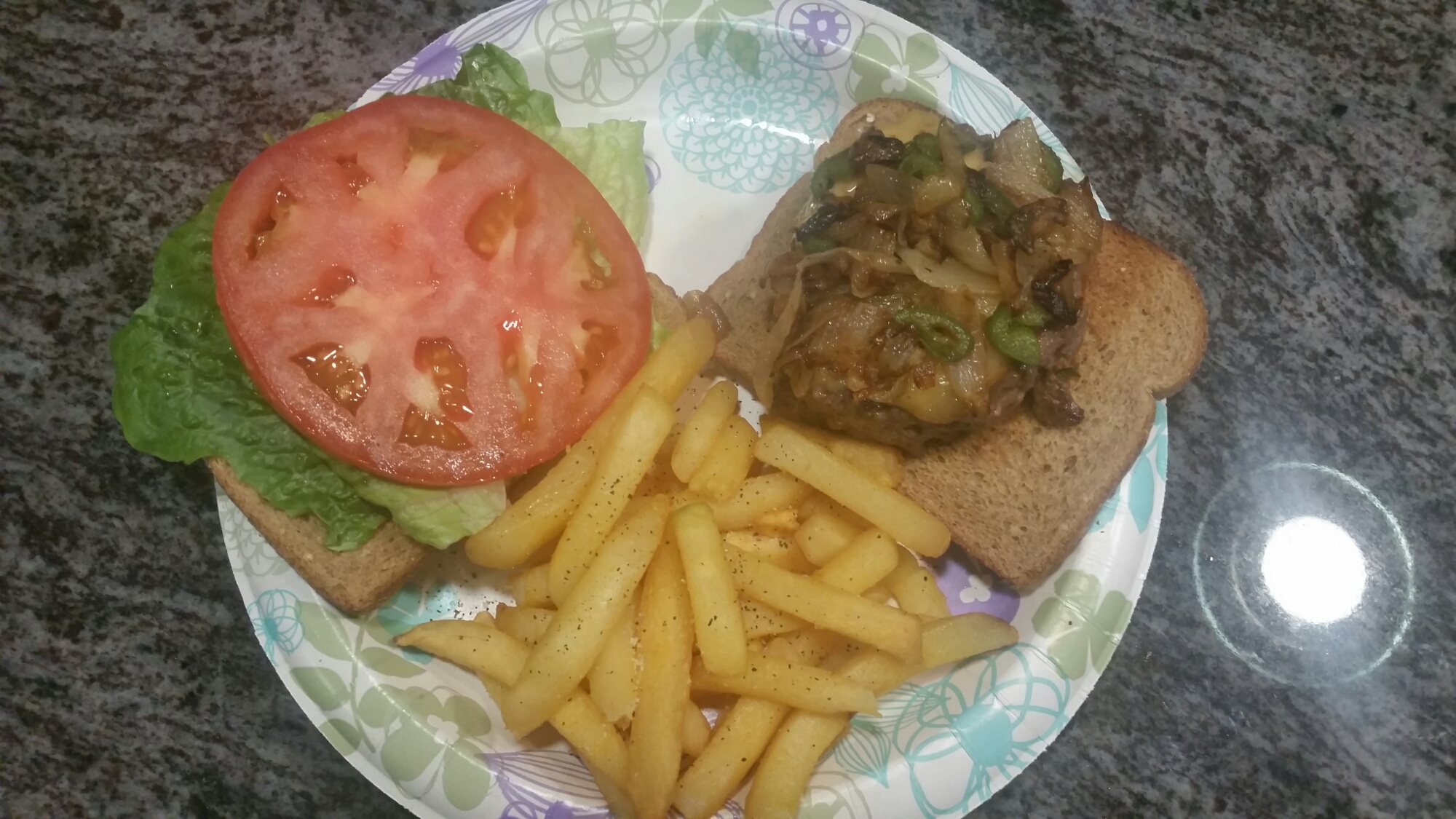 Time to plate! Toast your bun, or in my case sliced bread, and add your favorite toppers then the burger with the onion mixture on top. I like to do it restaurant style. Don’t judge me for using a paper plate. It was late and I needed to cut back on dishes!!