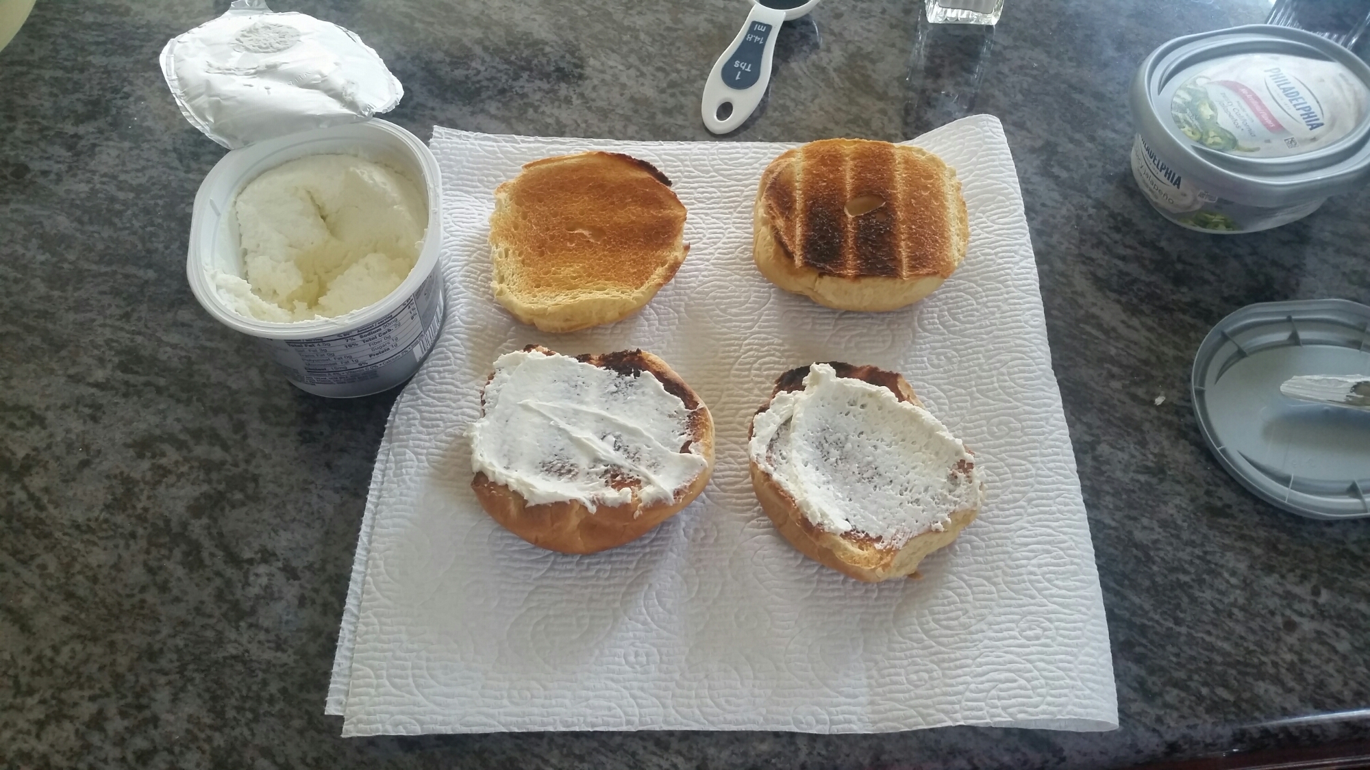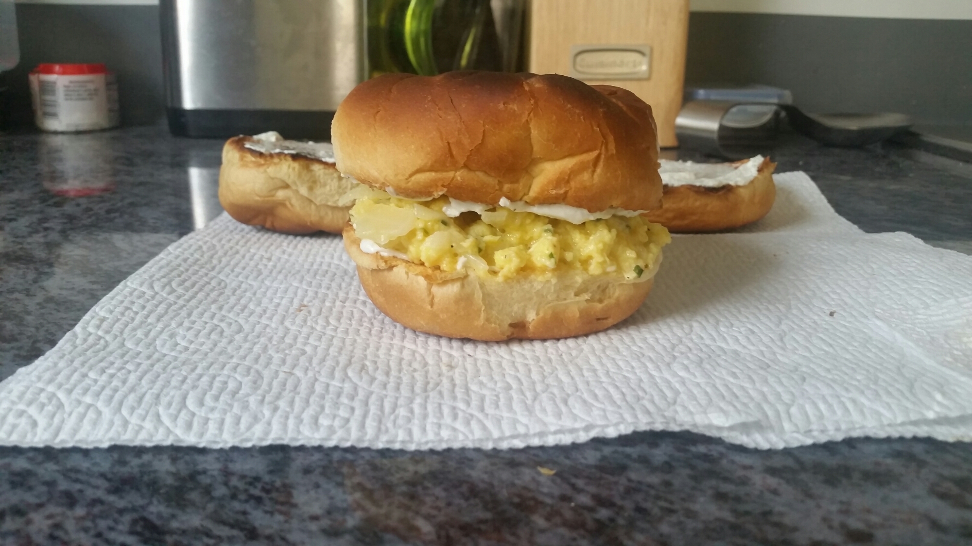 I like to make anything into a sandwich so I toasted up some left over hamburger buns that needed to be used.  Side Bar: if you haven’t got on the cream cheese and egg bandwagon I suggest you jump on…NOW!