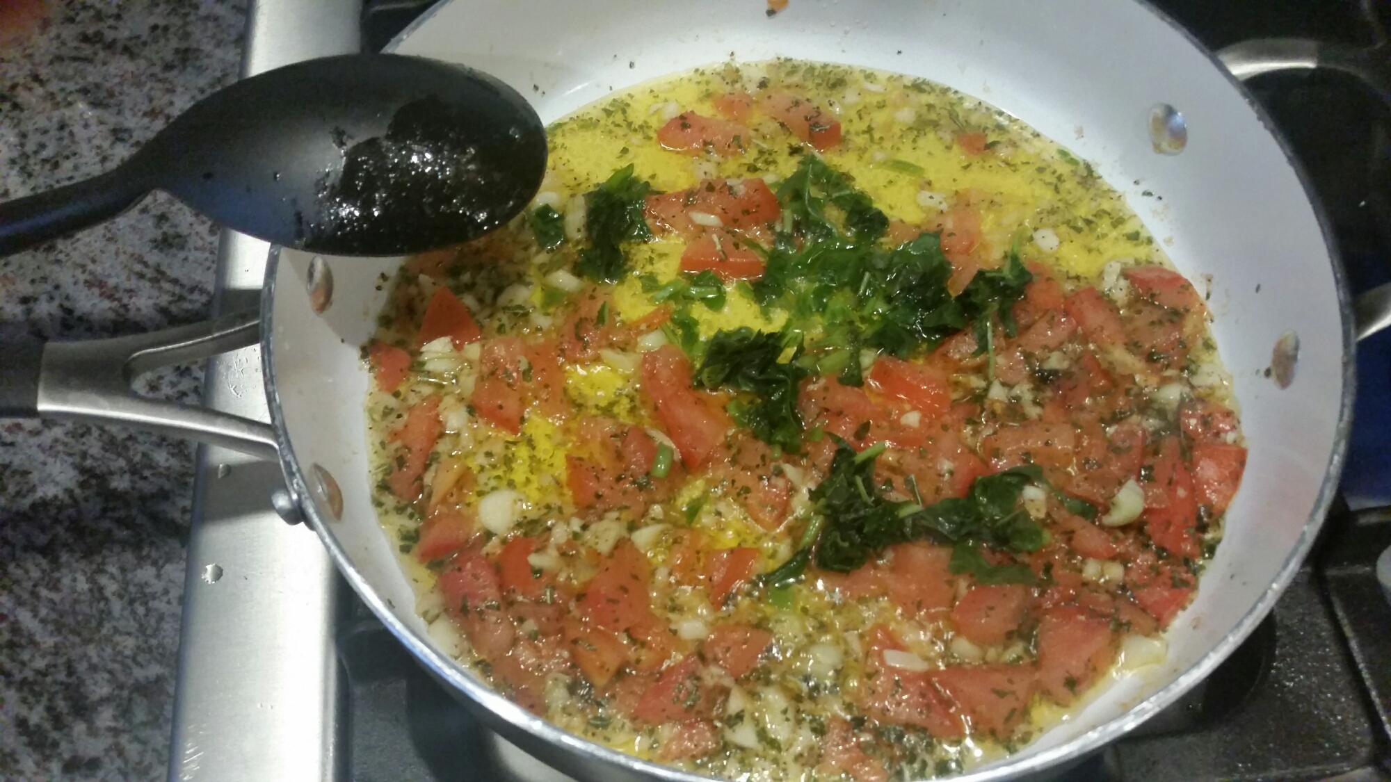 First add the oil to a pan and heat up on medium, then add your garlic. While that is sautéing chop up your tomato. My technique is cut the tomato in half, lay it cut side down, then chop in slices, stack the slices back up like your putting it back together again then cut slices going across, repeat with other side, add the chopped tomato to the pan. Add a dash of salt and pepper and the dried basil and simmer for a minute or two. Then add your fresh basil, another dash of salt and pepper, and let simmer for another 15 minutes while stirring occasionally. In the meantime fill a pot of water, sprinkle with some salt, and start heating it on high for cooking your pasta.
