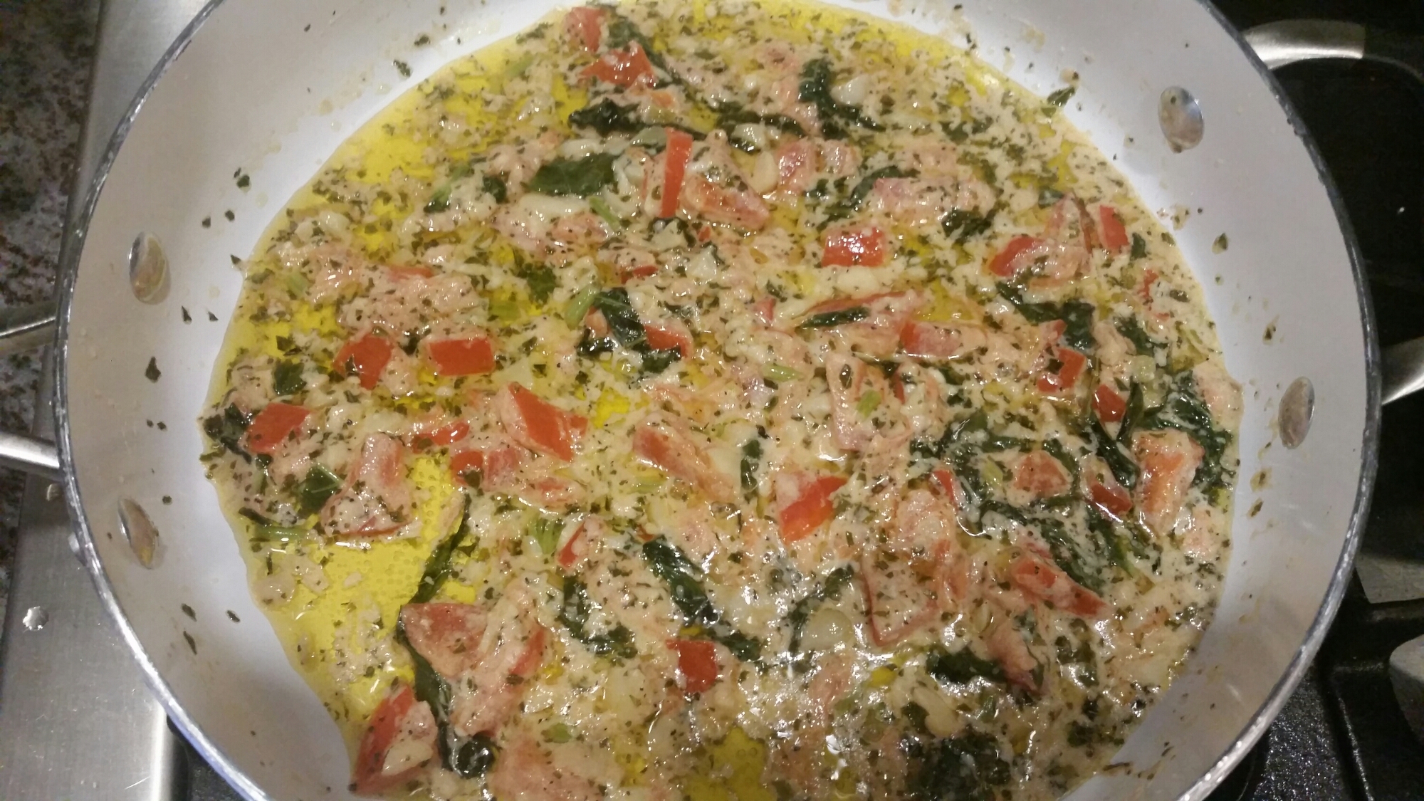 Cook your pasta until its a LITTLE more on the al dente, or harder, side because your going to add it to your pan and toss it and you don’t want to end up with mush! When its done strain it and a little at a time add it to the pan and toss it around. If you dump it all in at once it is SO much harder to mix around, trust me 🙂