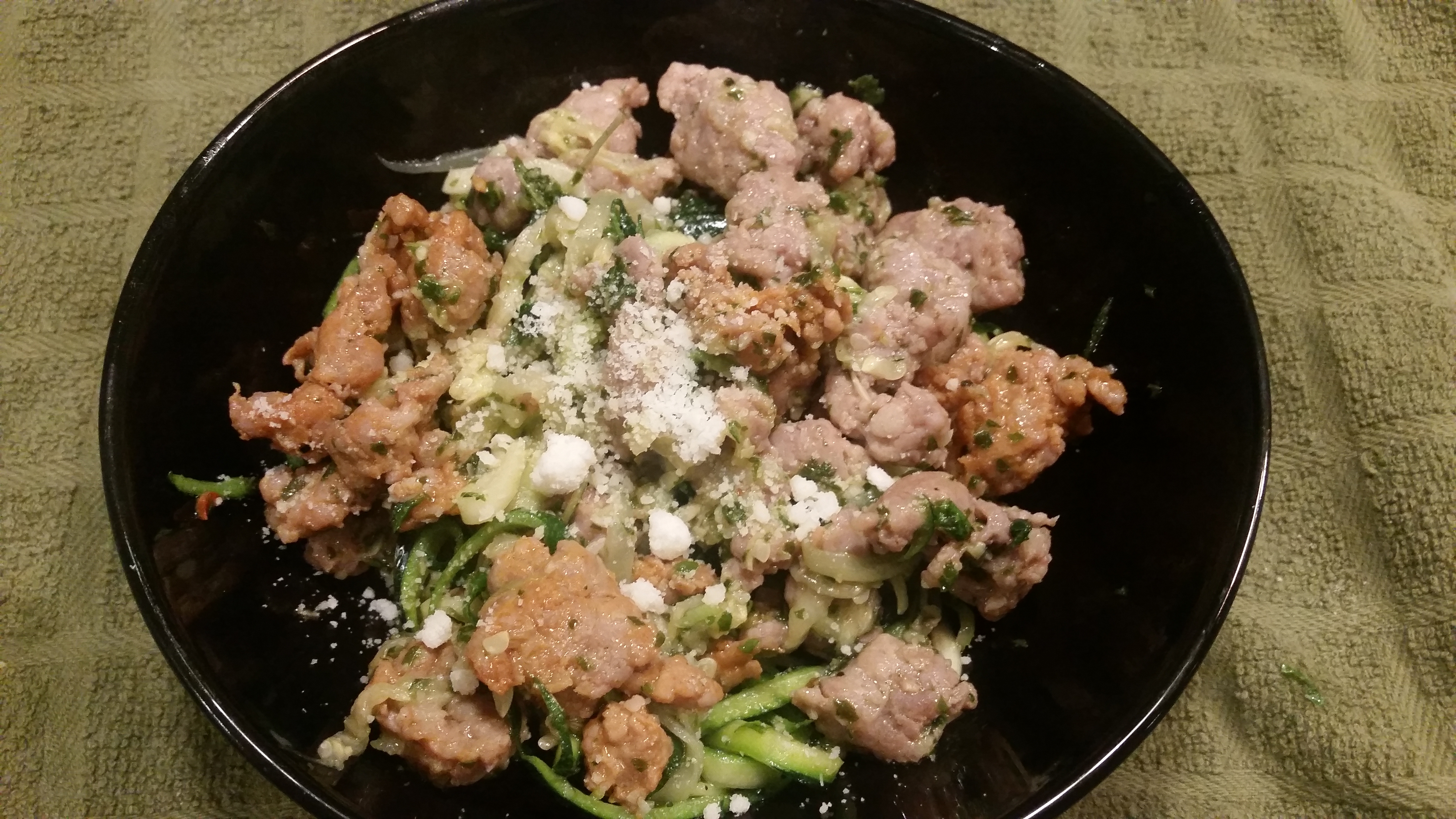 Heat the oil in a pan and cook the garlic for about 5 minutes then throw in your ground sausage and cook through. Then toss with the zucchini “noodles”, add some salt and pepper to taste, also top with some parmesan cheese if you like and enjoy!!! xoxoxo